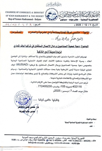 التعاميم - دعوة جمعية الصناعيين ورجال الاعمال في تركيا لزيارة مدينة ازمير التركية